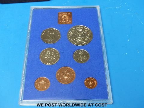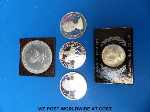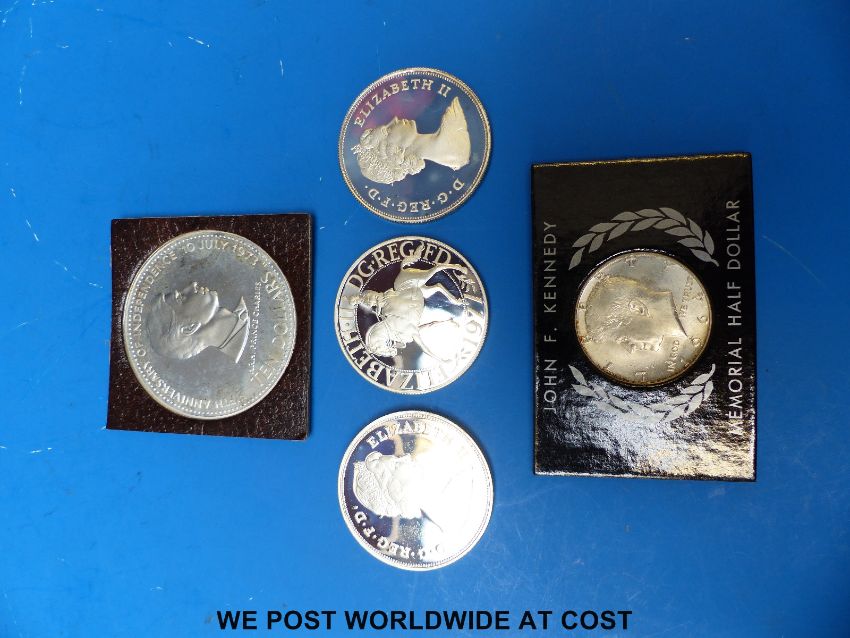 A quantity of cased collectable coins to include three silver commemorative crowns, a 1978 ten dollar proof silver example, 50mm diameter, a 1964 half USA dollar and a collection of cased UK sets, Great Britain halfpennies etc