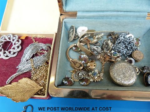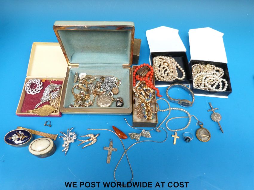A quantity of costume jewellery to include an amber brooch, marcasite brooches, enamel buttons, pearl brooch, locket, hallmarked silver brooch etc