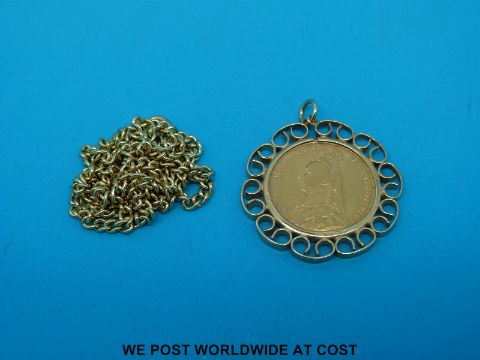 An 1890 gold full sovereign in 9ct gold mount on 9ct gold chain (20.7g all in)