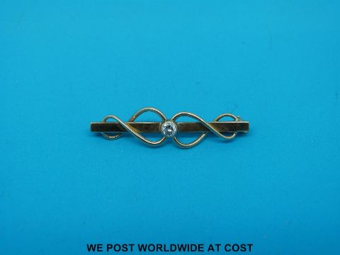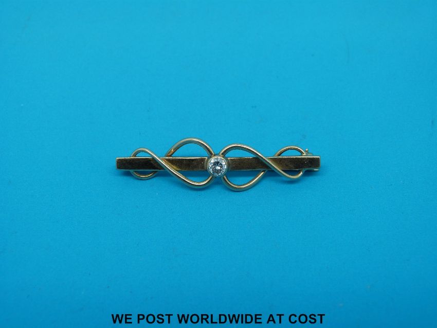 A 9ct gold brooch set with a round brilliant cut diamond (3.6g all in)