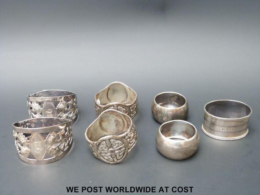 Three pairs of hallmarked silver napkin rings to include Walker & Hall and Iona Celtic design, together with a further silver napkin ring (220g)