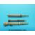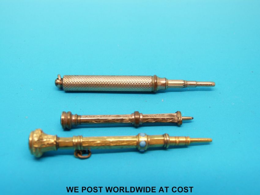 Three yellow metal miniature propelling pencils, one with intaglio finial, one hardstone with turquoise jewelling and an engine turned example