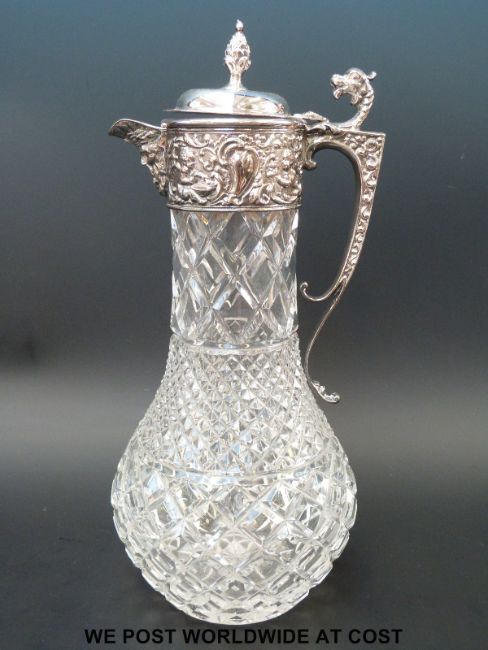 A hallmarked silver mounted glass claret jug with mask spout dragon thumb piece and pineapple finial, London 1973, maker Nat Joseph (height 32cm)