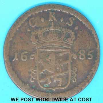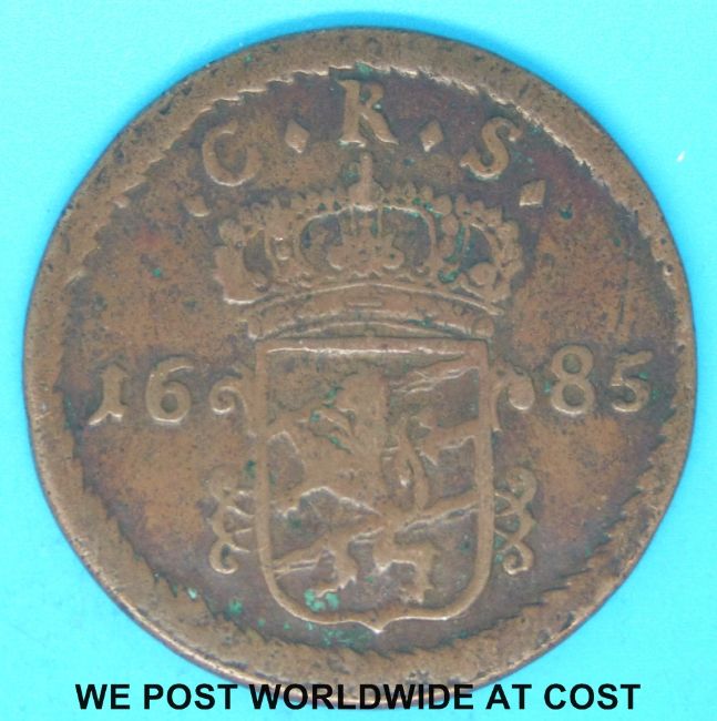 A large bronze 1685 Charles II coin, CRS rampant lion coat of arms under crown, reverse crossed arrows 10R SM crown above, star below