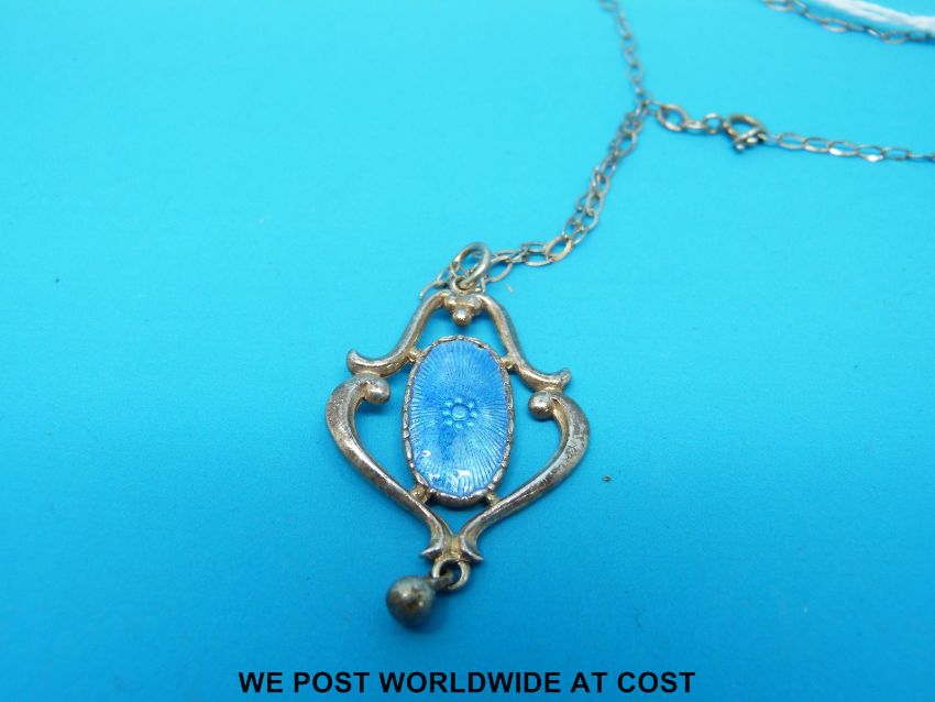 A hallmarked silver pendant by Charles Horner set with an oval section of blue enamel, on a silver chain