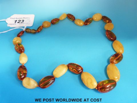 An amber necklace consisting of 25 graduated alternating translucent and butterscotch beads, the largest 2.5 x 1.3cm, 50cm long, (29g)