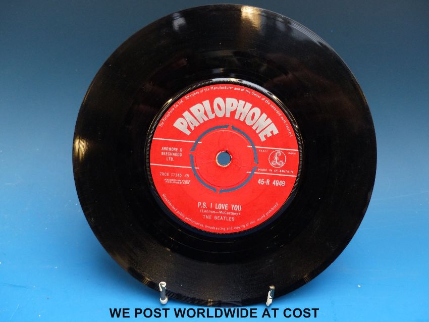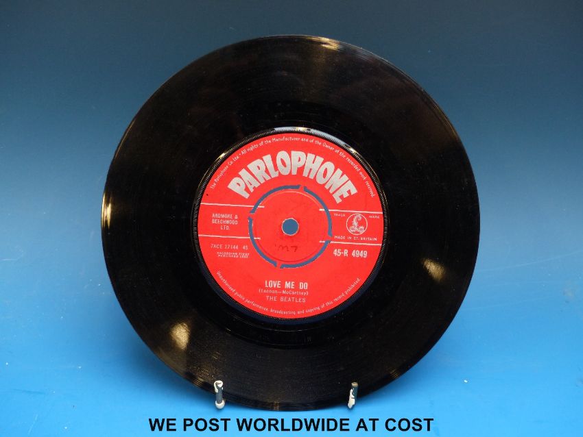 The Beatles “Love Me Do” (Parlophone 45-R 4949, first pressing, Red Label, matrix 7XCE 17144 1N). The condition of the vinyl appears to be in very good/excellent condition.
