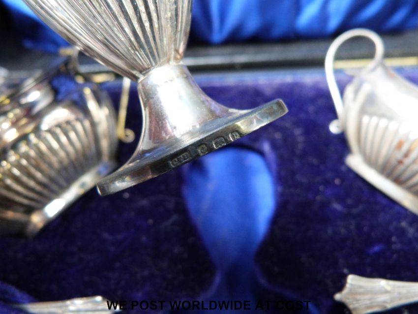 A cased hallmarked silver cruet set, pair of hallmarked peppers and two hallmarked silver napkin rings (154g)
