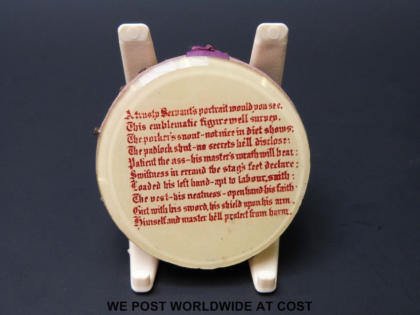 A late 19th / 20thC pin cushion with decorated glass plaque ' A piece of antiquity painted on the wall adjoining to the kitchen of Winchester College and Manners Maketh Man' with verse verso, 4.3cm diameter
