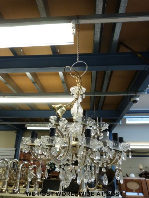 A brass and cut glass chandelier fitted for electricity