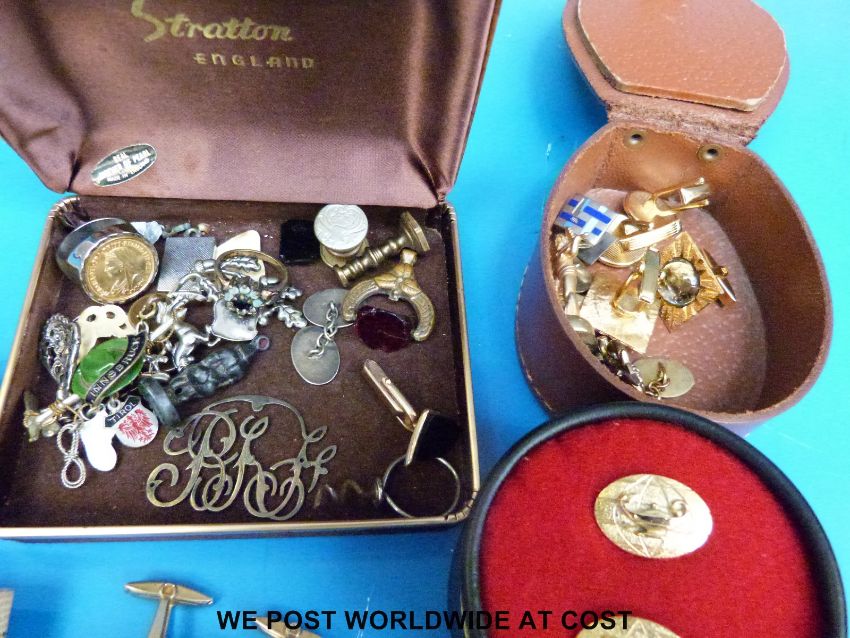 A quantity of cufflinks to include tigers eye and a cheeroot holder with hallmarked silver mounts and amber end