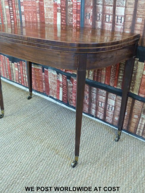 A 19thC mahogany fold over card table raised on square tapering legs and brass castors (H74 x L102 x W50cm)