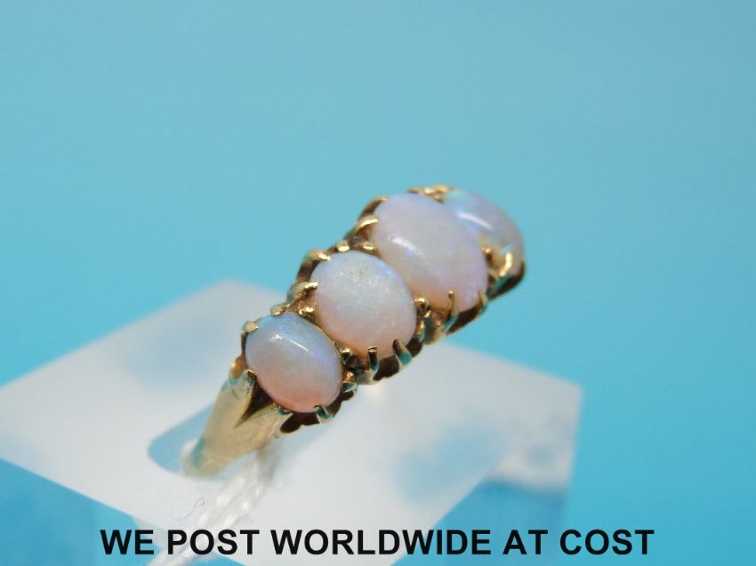 A yellow metal and rubies ring set with five graduated opals marked 18ct, (size O)