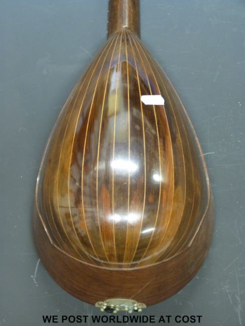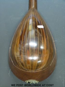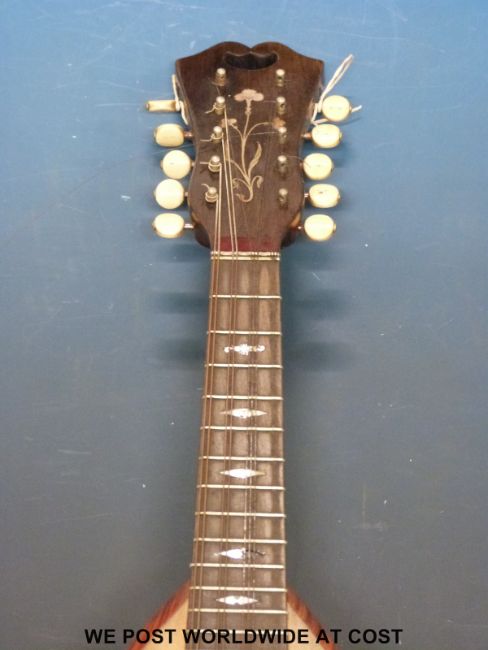 A bowl backed mandolin by Umberto Geccherini of Naples, c1880 label inside and sold through Alban Voight & Co, London E.C., No 2300 'Sistema Brevettato' stamped to table, decorated tortoiseshell finger plate and matching tail piece inlaid with mother of pearl, ten ivory tuning pegs, floral and foliate design, in case with strings etc in an original box with various ivory and tortoiseshell plectrums