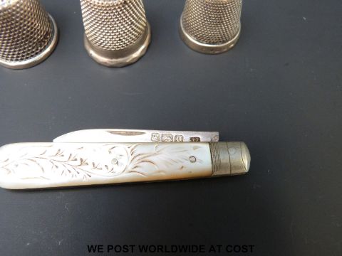 Six hallmarked silver thimbles to including two by Charles Horner and a hallmarked silver pen knife