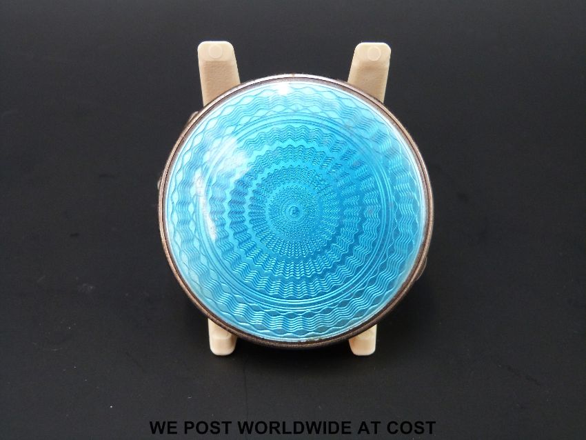 A hallmarked silver guilloché enamel hinged pill box, London 1930, maker HP & S (diameter 5cm)