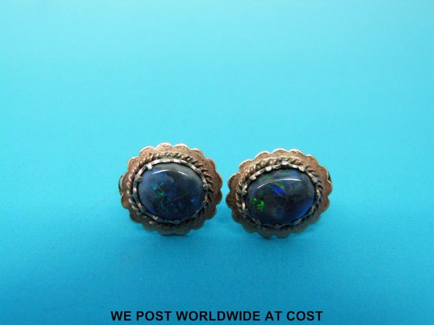 A pair of yellow metal earrings set with opal doublets