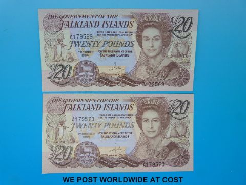 A pair of uncirculated Falkland Islands £20 bank notes, A179569 and A179570 1st October, 1984