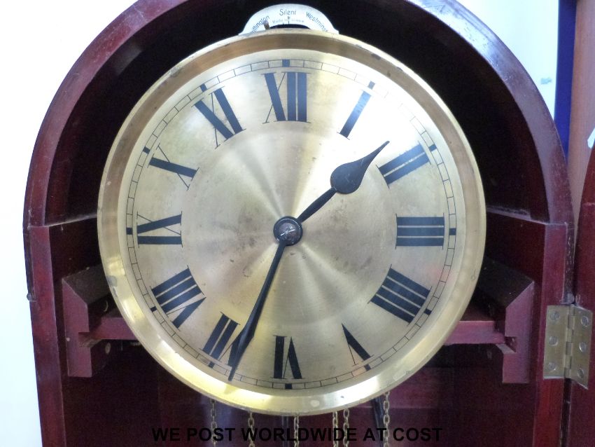 A c1920 Grandmother arch topped clock thought to be Gustav Becker, in mahogany case, dual chime mechanism brass dial, reeded decoration to foot, weights visible through bevelled glass door