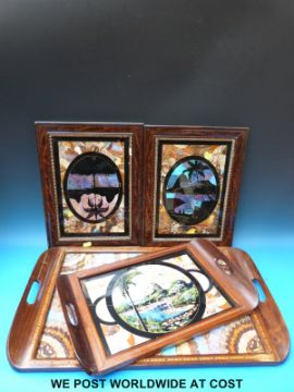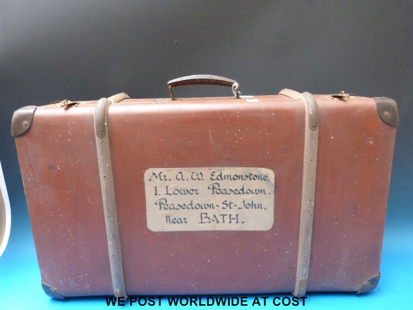 A vintage ash bound suitcase, two butterfly wing trays and two pictures