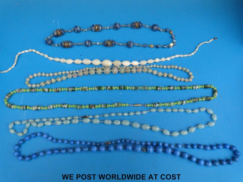 A mother of pearl beaded necklace, a graduated glass bead necklace, blue glass necklace, a graduated glass bead necklace with colourful flecks and a Venetian green beaded necklace