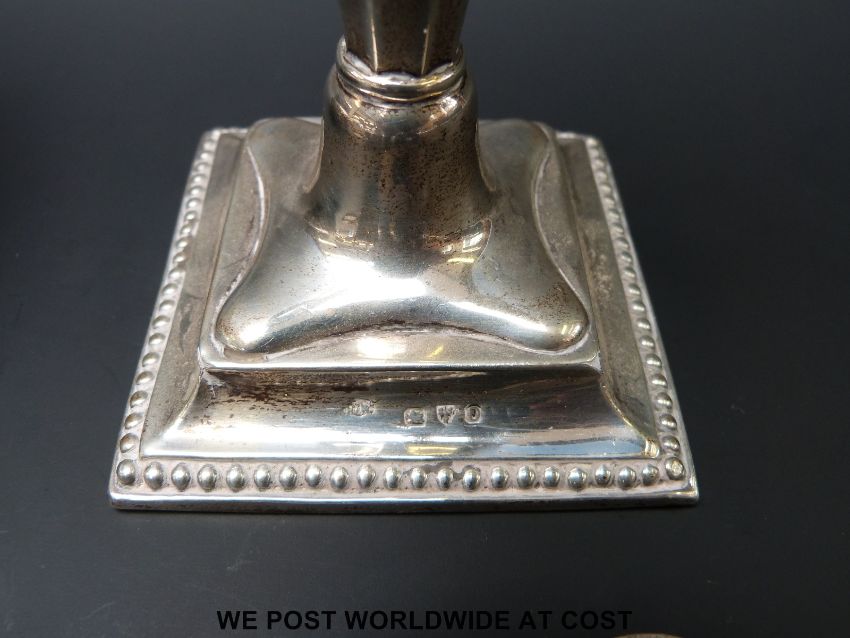 A hallmarked silver screw top pill box, hallmarked silver candlestick, white metal basket (156g) and approximately 113g of pre-1947 coinage