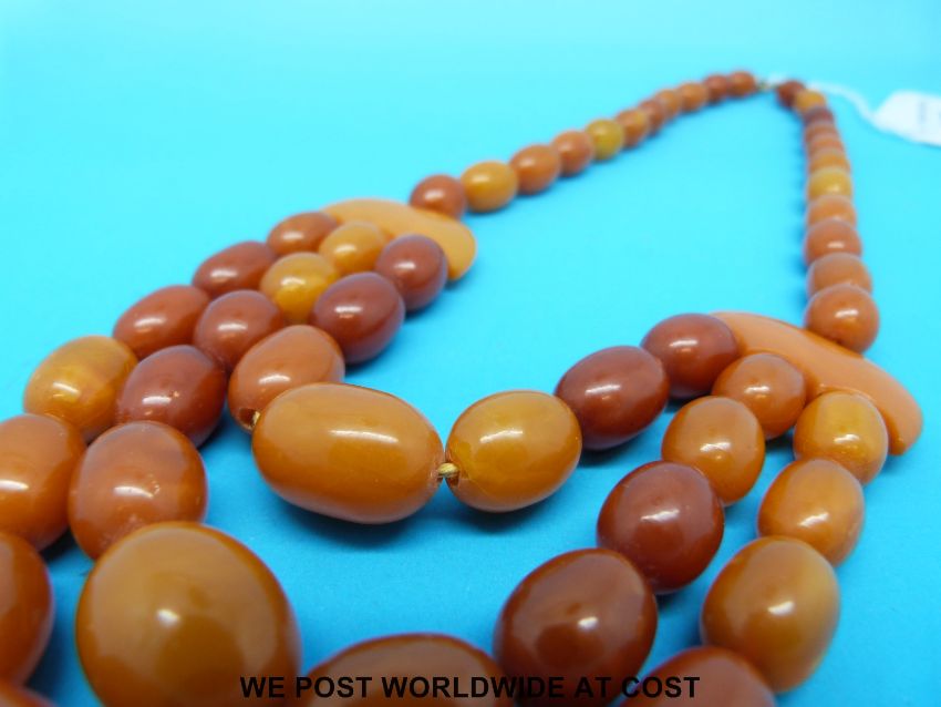 An amber necklace consisting of 55 graduated ovoid beads in three strands with crescent shaped links, the largest bead 20 x 15mm , total length 66cm (44g)