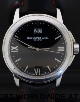 Raymond Weil Tradition gentleman's wristwatch with date aperture and stainless steel numerals and hands on black face in stainless steel case, on black leather strap, marked to the back of the case '5576 E219815', case diameter 42mm, in original box with outer case.
