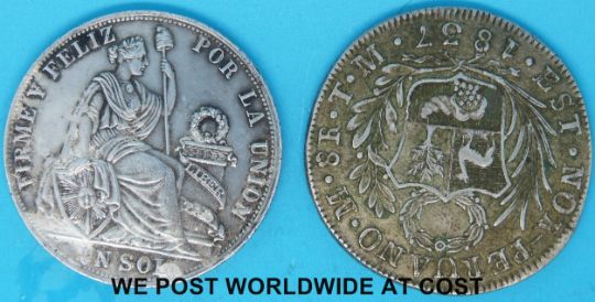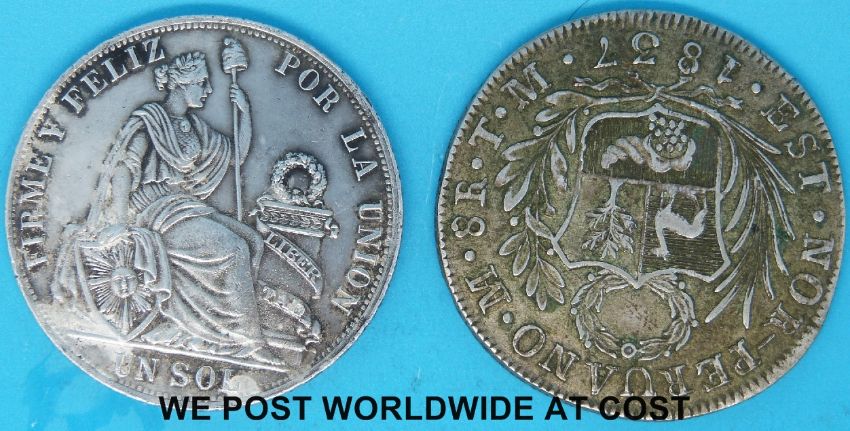 An 1837 Peru 8 Reale crown sized coin together with an 1888 silver 1 Sol Peru coin