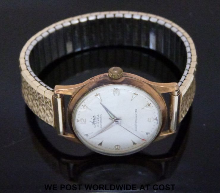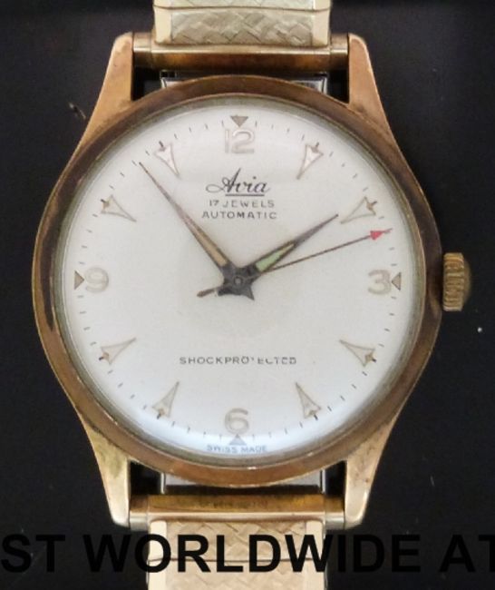 Avia shock-protected gentleman's automatic wristwatch with gold hands and markers in gold plated case, on expanding metal bracelet. Case diameter 35mm (in original box)