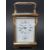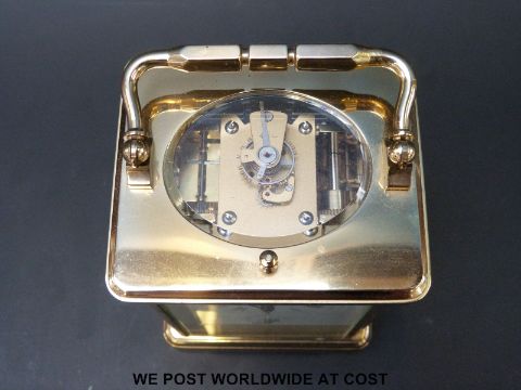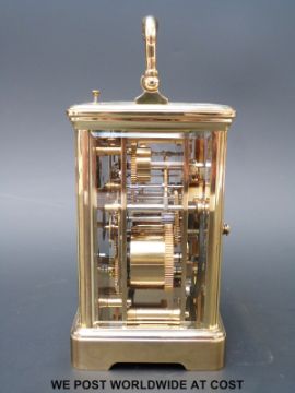 A brass repeater carriage clock striking on a gong. Angelus to white enamelled dial, Breguet style hands and secondary alarm dial