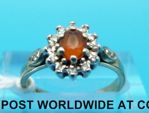 A 9ct gold set with a citrine surrounded by diamonds (size J)