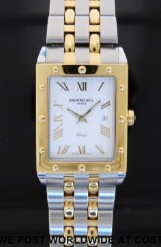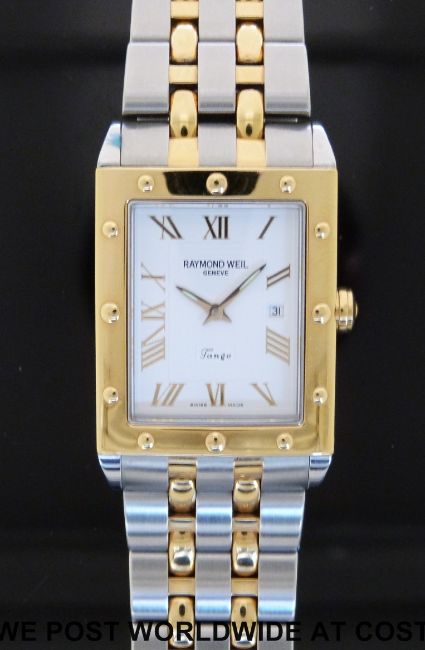 Raymond Weil Tango gentleman's wristwatch with date aperture, gold Roman numerals and luminous hands on white face in bi-metal case, on matching bracelet, marked to the back of the case '5381 K060736', case size 28x33mm, in original box with outer case.