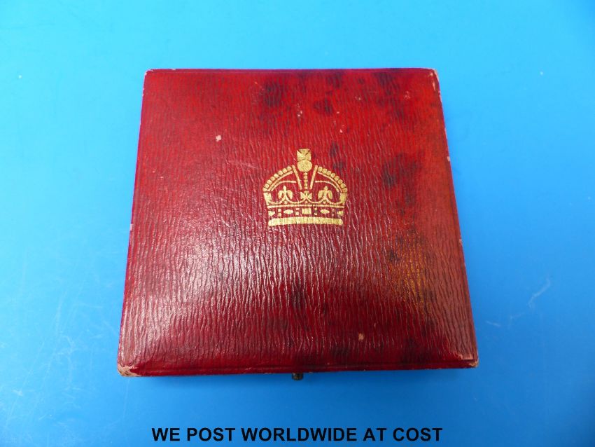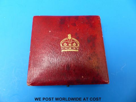 Three cased silver proof crowns and a 1902 Coronation medal, possibly silver gilt, together with a cased Edward VII Coronation medal