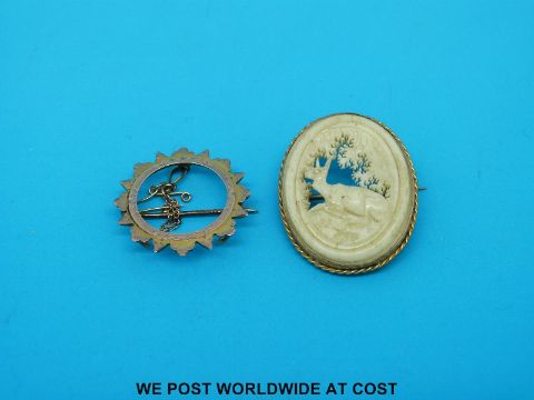 A 9ct gold brooch and a yellow metal brooch set with bone