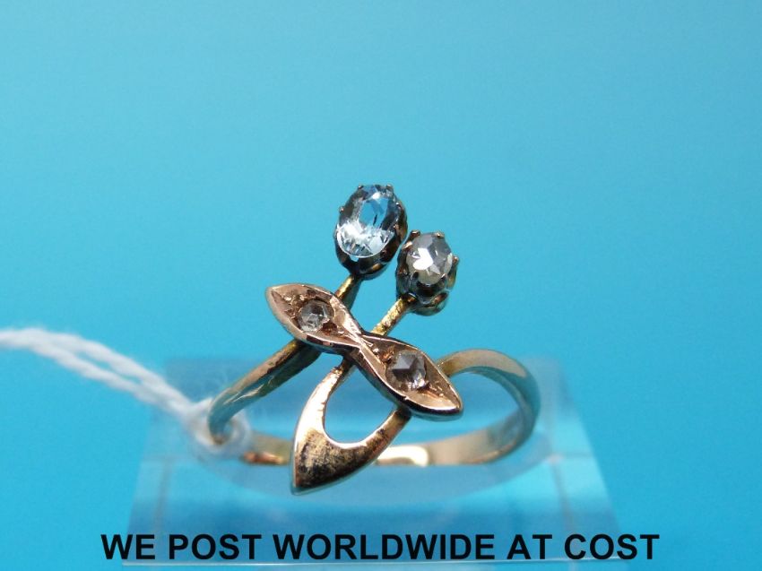 A Russian gold ring marked 56 set with an aquamarine and rose cut diamonds in a stylised foliate setting (size K)