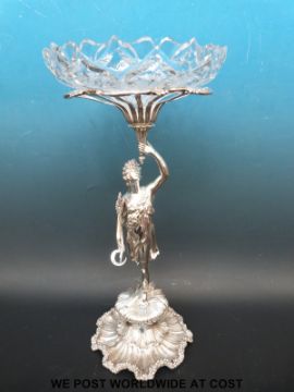 A silver plated and cut glass centrepiece formed as the goddess Ceres, 44cm tall