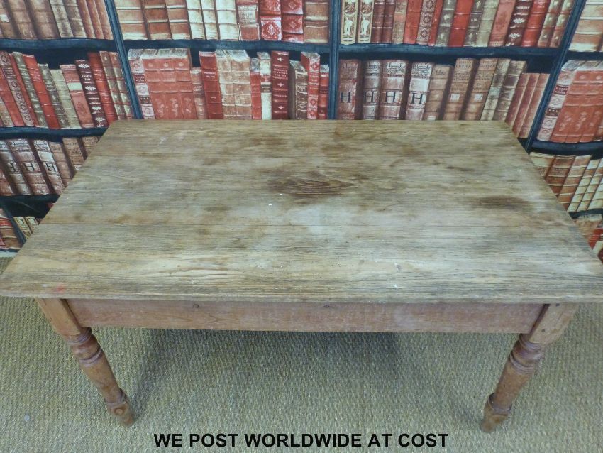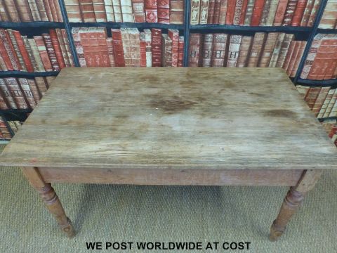A scrubbed pine three plank kitchen table (H74 x L137 x W80cm)
