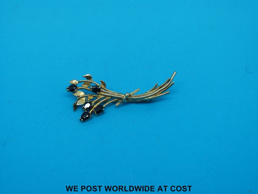 A 9ct gold brooch set with sapphires in the form of a bunch of flowers (3g all in)
