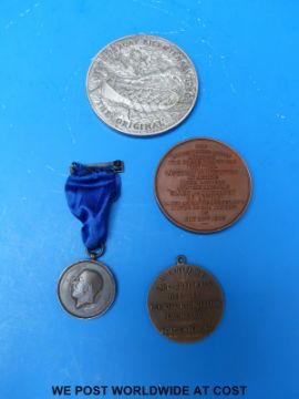 A cased bicentenary 1790-1990 Lifeboat medal coin (63mm diameter, silver hallmark, weight 152g). Lifeboat race medal and a cased 'war valley' medal inscribed '37 lives saved from the SS war valley by the Corleston Lifeboat, Elizabeth Simpson in 1919' and a further 19th century cased Christopher Brown example