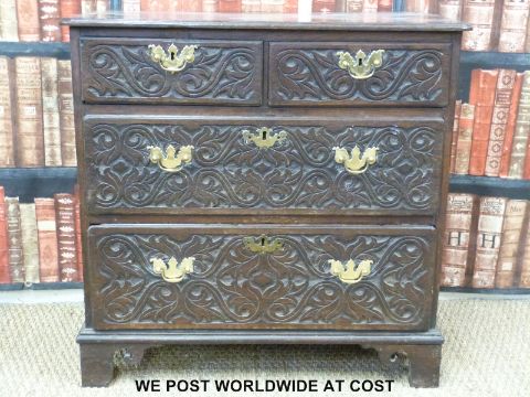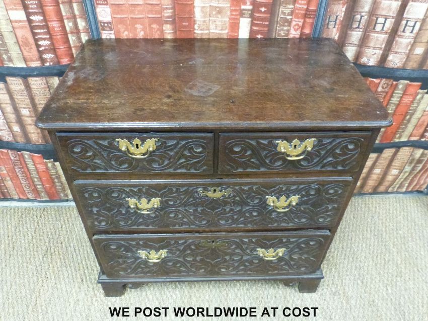 A Georgian carved oak bachelor's chest of two over two graduated drawers, raised on bracket feet (76cm tall, 78cm wide, 46cm deep)