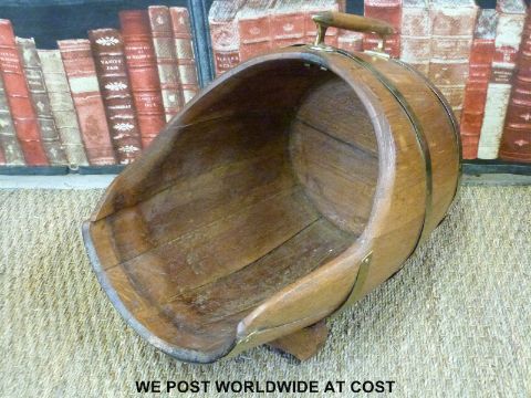 An 18thC elm stool, a barrel on a stand together with a scuttle in the form of a coopered barrel