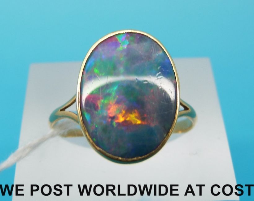 A yellow metal ring marked 18ct gold set with a doublet opal, (size P, 2.7g)