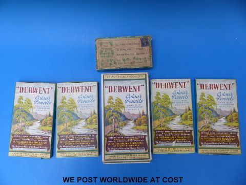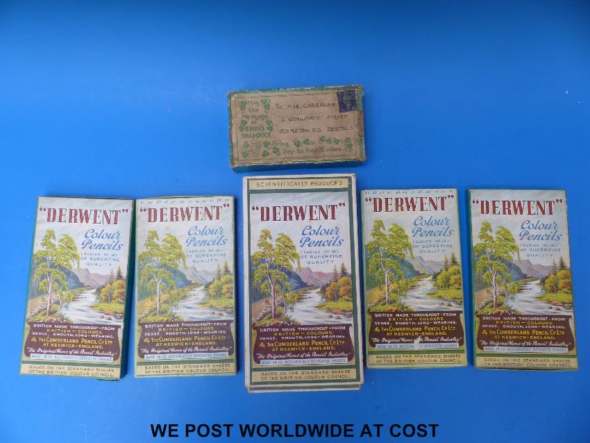 Five boxes of pencil crayons together with a box of dried shamrock