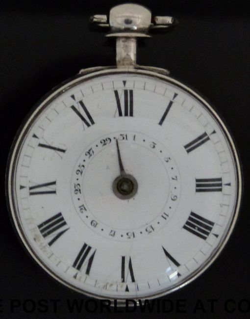 An 1835 silver gentleman's calendar pocket watch with fusee movement and verge escapement, pierced and masked balance cock by Lewis Wyatt, Macclesfield