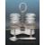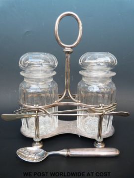 Two cut glass pickle jars and forks on silver plated stand, together with a teaspoon with 'Titanic' Millvina Dean engraving