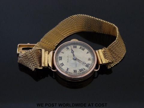 Rolex 9ct gold ladies wristwatch with black hands and Roman numerals, on mesh link strap, case diameter 20mm.