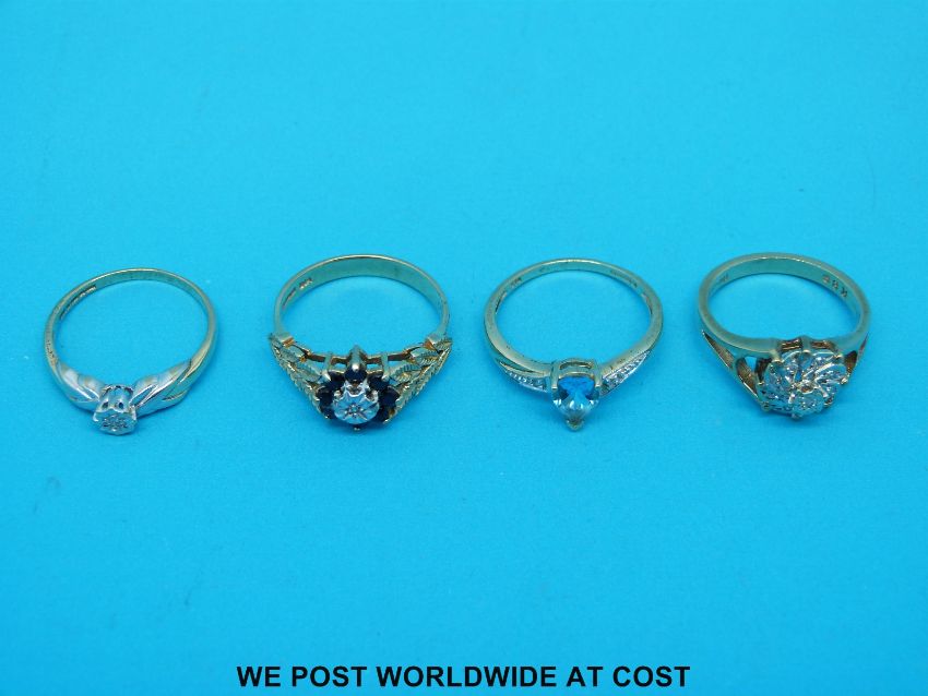 Four 9ct gold rings, one set with diamond and sapphires, one diamond cluster and a topaz and diamond set one.