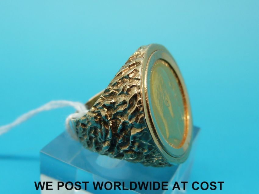 A 9ct gold ring with textured shoulders set with a 1909 gold half sovereign (size M, 12.7g)