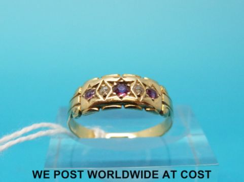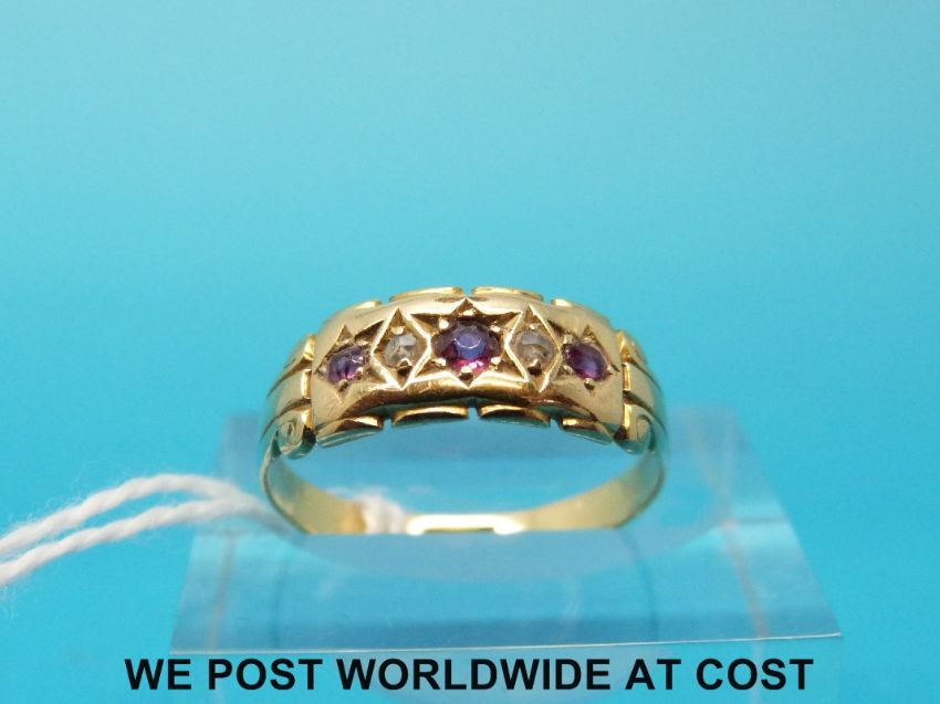 A yellow metal ring marked 18ct set with alternating diamonds and rubies (size K/L)